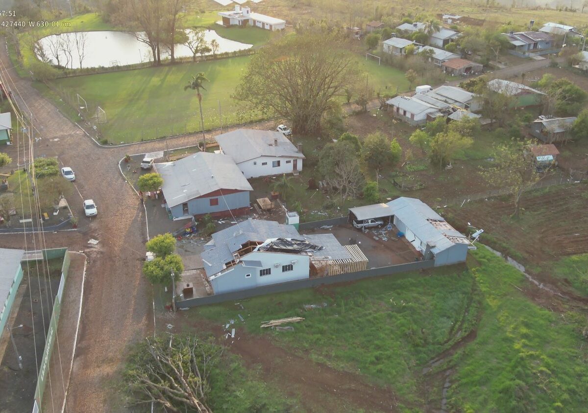 De acordo com relatos locais e imagens de drone fornecidas pela Coordenadoria Regional de São Miguel do Oeste, é possível observar um caminho de destruição com telhados parcialmente destruídos e árvores tombadas, características condizentes com a ocorrência de tornados.